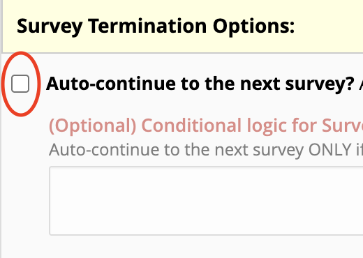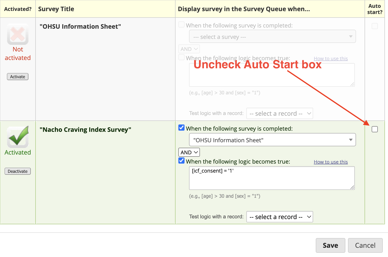 If the participant should move on to another survey immediately after completing e-consent, there must be a pause in the flow of surveys to allow the participant to see either the download button (Option #1 above) or to enter their email address if their email is not already collected in the project (Option #2 above). A pause in the flow of surveys can only be affected by connecting the e-consent survey to the next survey via the Survey Queue, and unchecking the Auto Start box (see screenshot below). It is not possible to pause surveys when using the Auto-Continue option in Survey Settings.