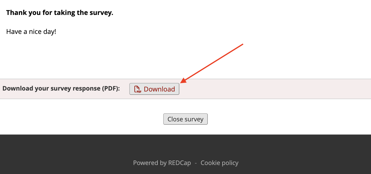 It is a requirement of research to return a copy of the consent form that a participant signed. When using REDCap for e-consent, it is up to the study team to determine if they want to use the tools in REDCap to return a PDF copy of the e-consent survey to the participant, or if they want to use methods outside of REDCap to handle returning a copy of the consent form to the participant. For teams electing to use the tools in REDCap, there are two options detailed below, which will generate a PDF of the participant's signed and submitted e-consent survey.
